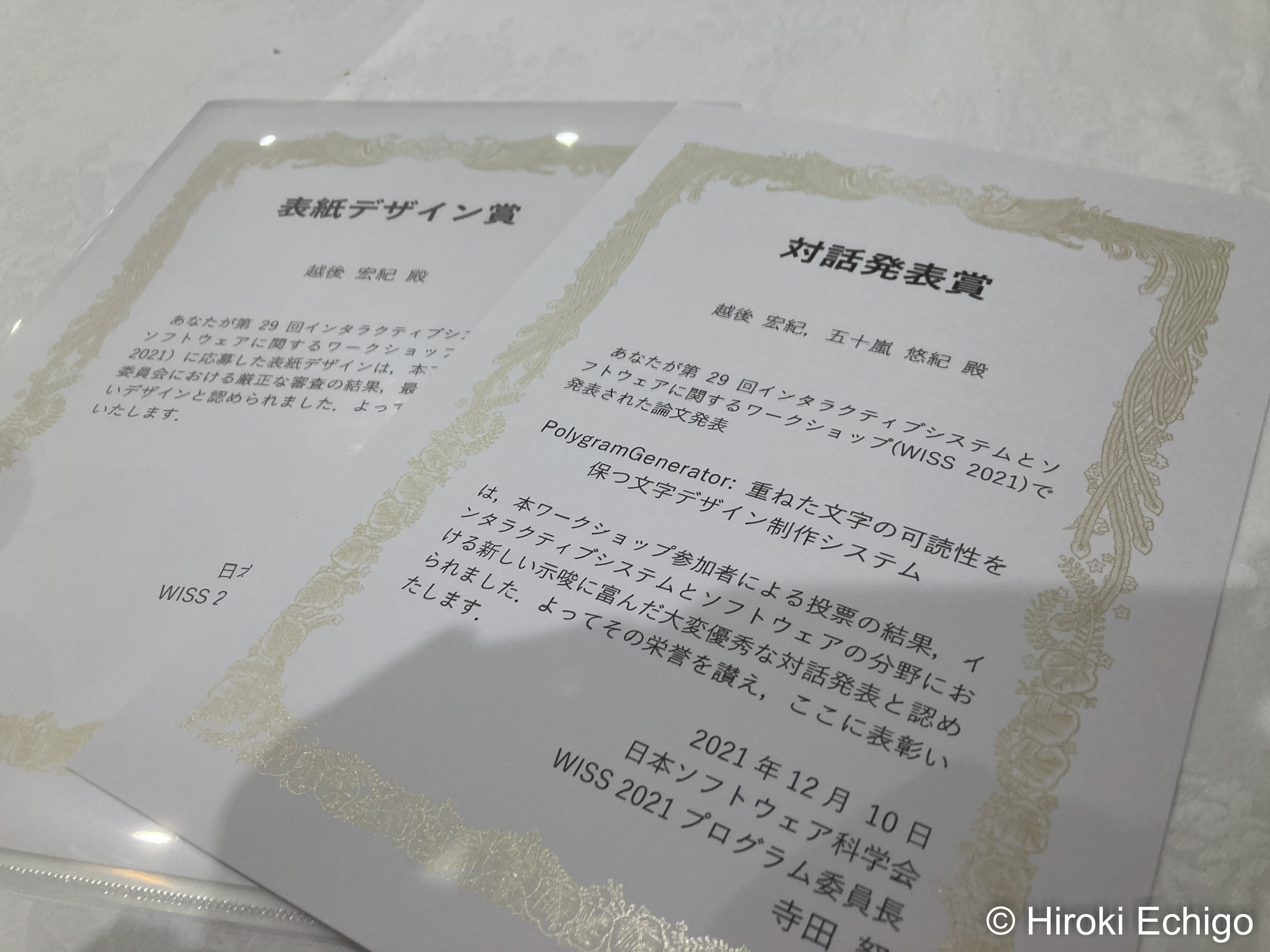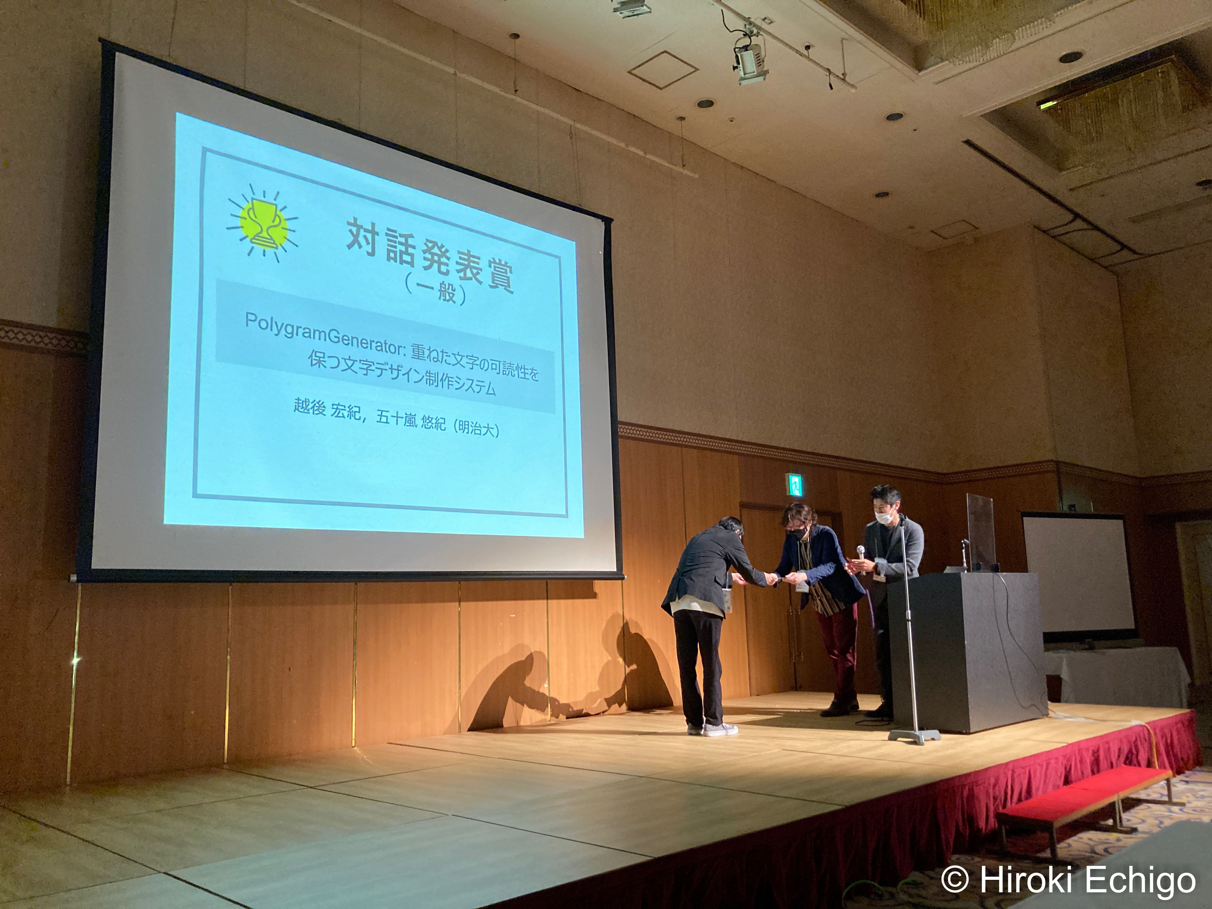 今年は表紙デザイン賞だけではなく、1日目に発表した「PolygramGenerator: 重ねた文字の可読性を保つ文字デザイン制作システム」で対話発表賞も受賞しました。
